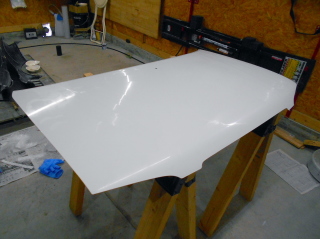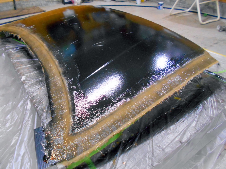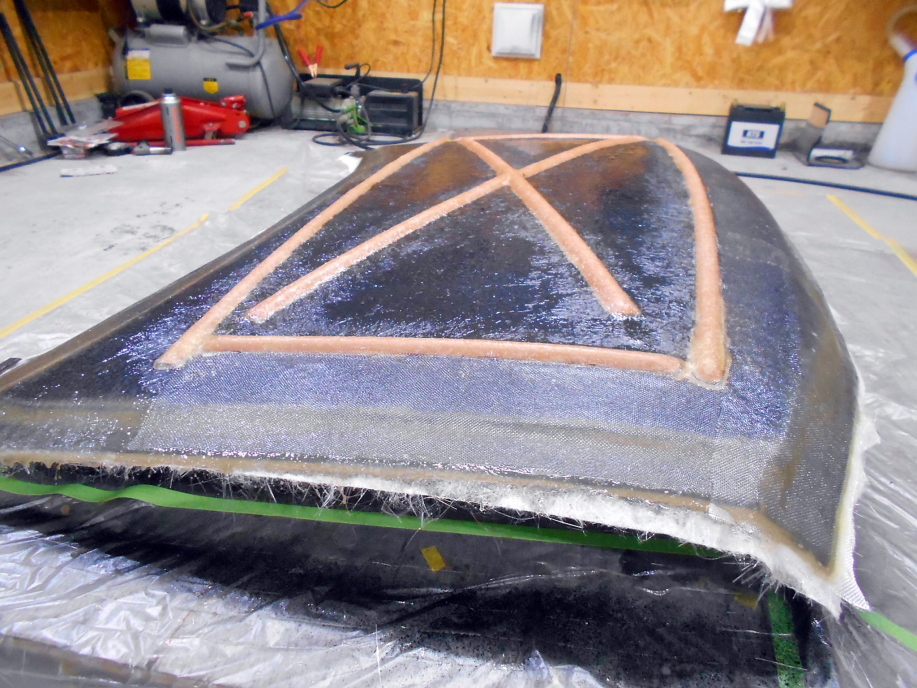 接着した発泡面木に細く千切った#450マットを2プライ被せて樹脂を塗り、メス型積層完了。 |