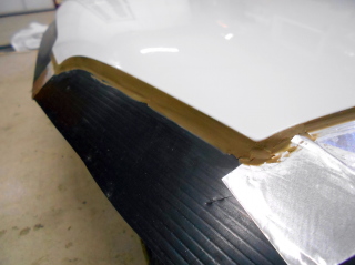 ボンネットのフチに両面テープを貼り、そこに5〜60mm幅に切ったプラダンを貼り付け、補強の為に養生テープを貼っておきます。
