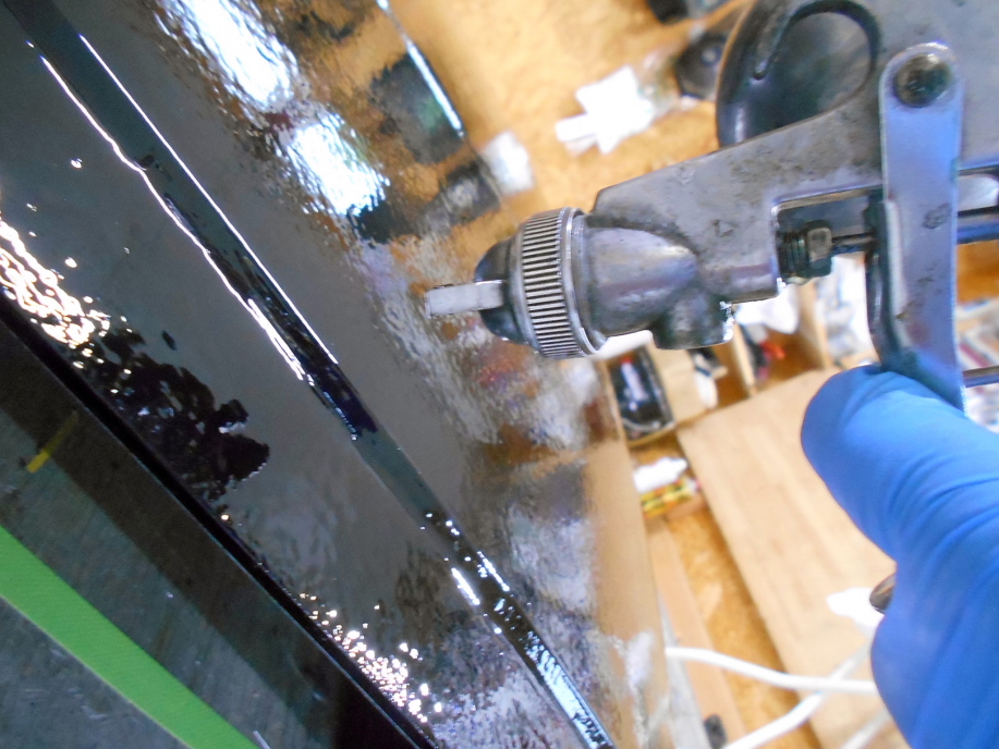 自宅ガレージで作業する場合、通常刷毛塗りにするんですが、刷毛塗りだとどうしても膜厚にムラが出来、膜厚を確保する為に2回塗りする事になるし、そもそも刷毛塗りは苦手であまりきれいに塗れない事が予想されるので、ガン塗りにする事にしました。