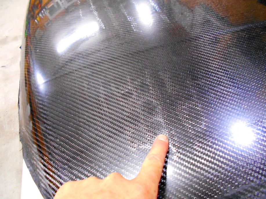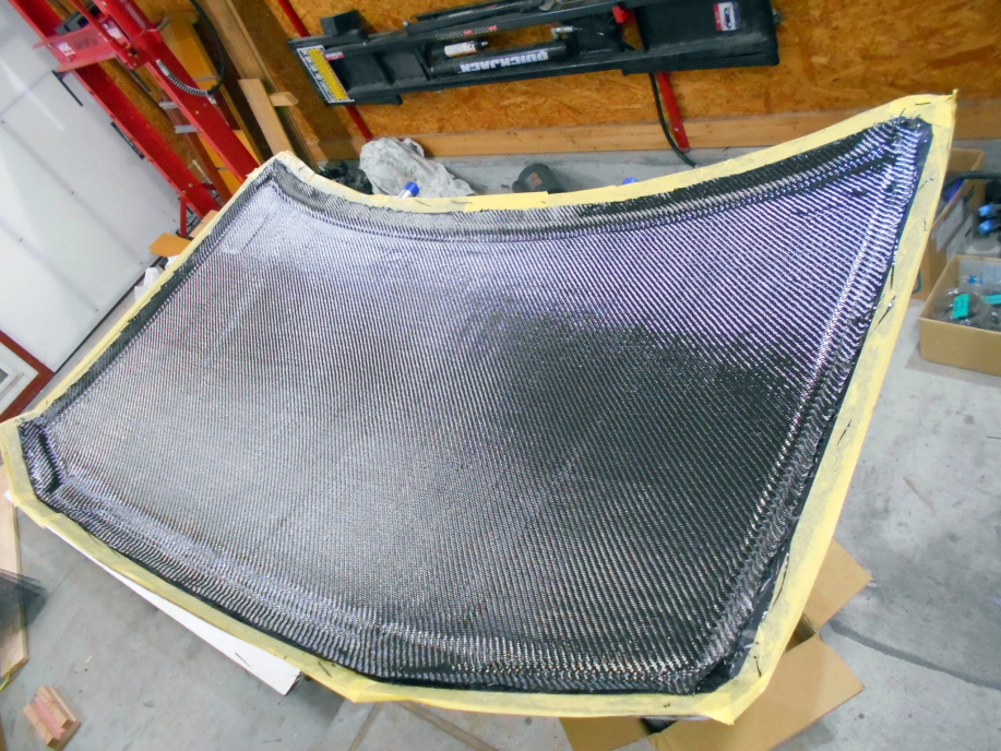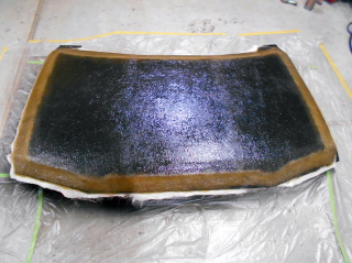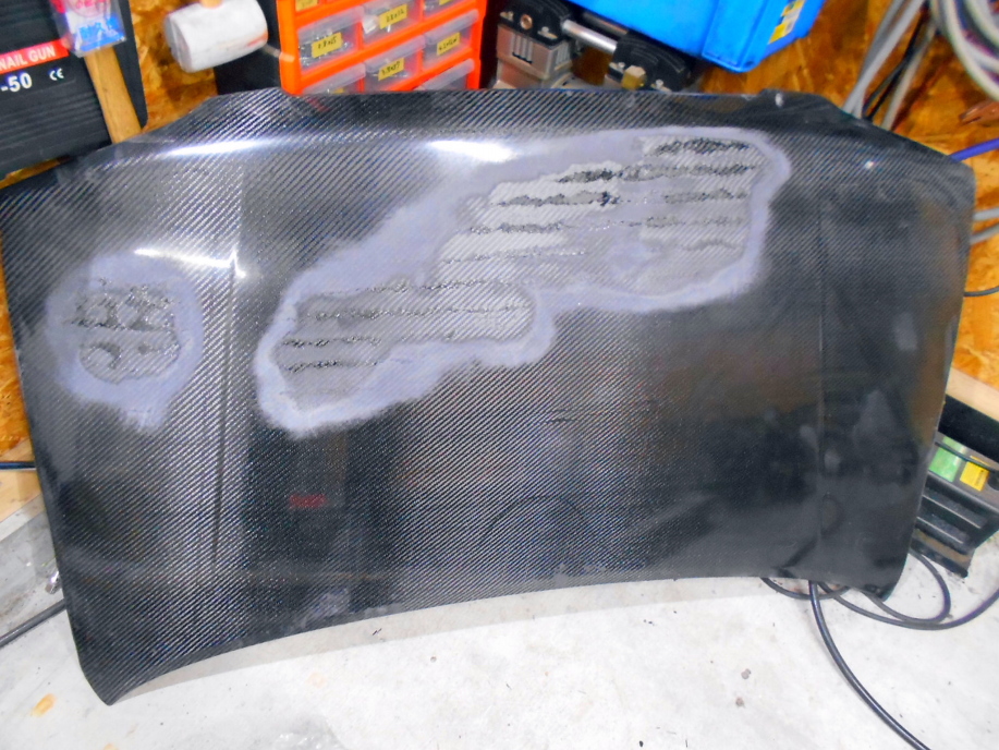 発泡パネルがしっかり付いたらボンネット周囲に50mm幅くらいのカーボンクロスを貼り、最後に全体に1枚、カーボンクロスを貼ります。