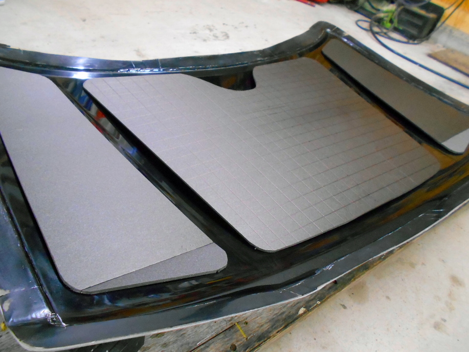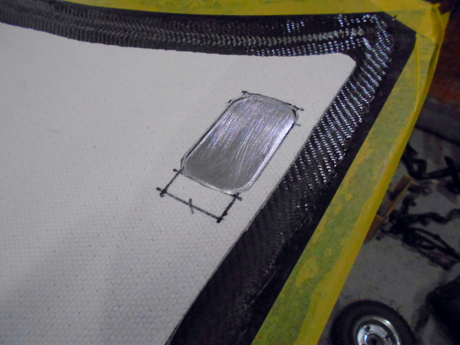 ただ、これだけだとボンネットヒンジ取付け部付近の強度が心配になったので、ヒンジが取り付く位置のコアマットを切り抜き、3mm厚のアルミ板を配置しました。