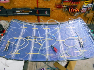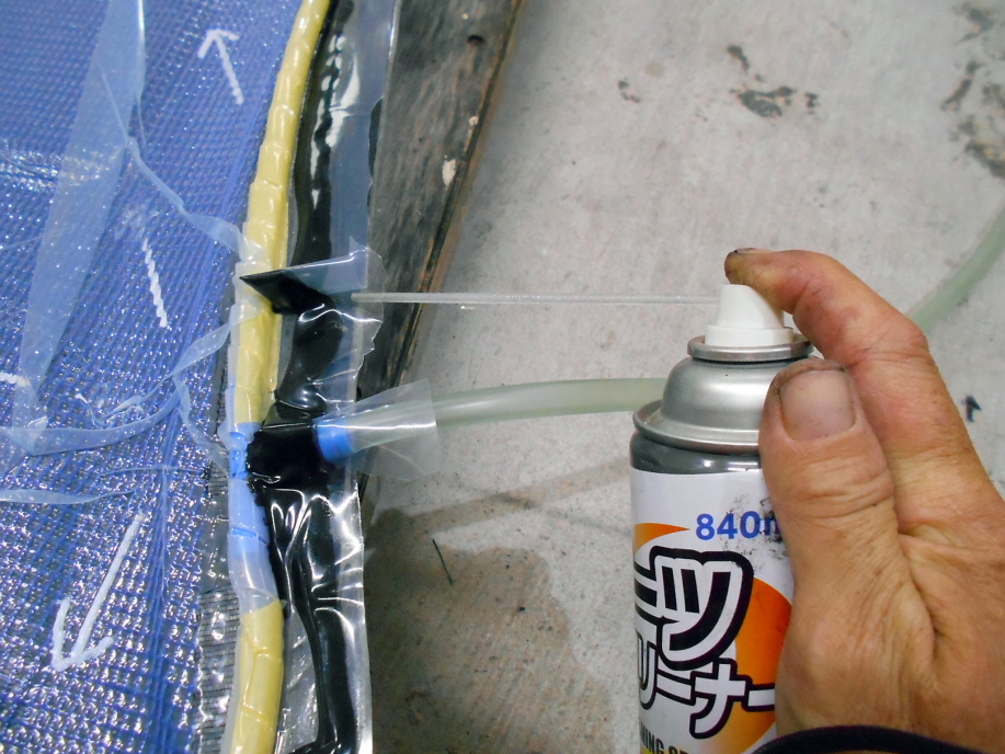 その後農業用ネット(4mm目)を置き、樹脂とバキューム用のホース類を配置し、最後に農POフィルムをブチルゴムで貼り、バキュームの準備完了。