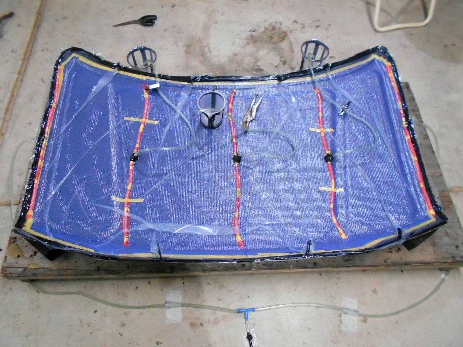 アンダーパネル製作でカーボンクロスの間に発泡材を入れるだけで格段に剛性が上がる事、発泡材を後から接着してサンドイッチすると、その際に使用する樹脂の量がけっこうバカにならず重量増になる事、等から今回は表裏のカーボンクロスと間に挟む発泡材を一回でまとめてインフュージョンしてしまう事にします。