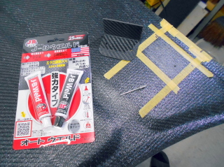 接着にはボンネット製作に使ったエポキシ樹脂を使っても良かったのですが、エポキシ樹脂は少量で作る場合、配合がかなりシビアになるし、粘度調整も面倒だったので、今まで何種類かの接着剤を試してきた中で接着力が信頼できるこの接着剤を使いました。