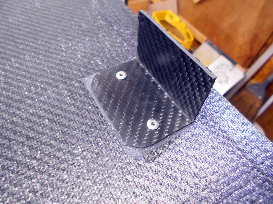 ボンネットに「ワンオフカーボンアンダーパネル2」を製作した際に余分に作っておいたカーボンL字アングル(10プライ2mm厚)を必要な長さに切って接着します。