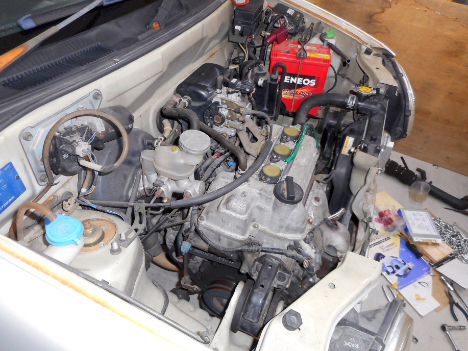 | ウチのアルトももうちょいで総走行距離20万キロ近くなり、ややパワーダウンを感じてきたので、そろそろエンジンのオーバーホールでもと考えていましたが、 たまたま走行距離71000キロのワゴンR(5MT)をタダで入手出来たので乗せ換えてしまう事にしました。 エンジン型式はもちろんK6AでNA、年式もほぼ同じでインマニやエアクリーナー形状も同じようなのでポン付けで行ける予定。 実働車なので自宅まで自走してきて特に不具合が無いことを確認出来ました。 早速ガレージに突っ込んでエンジンを外します。これがFactoryでの初仕事です! 本来これ系のエンジンはミッションごと下に降ろすのですが、リフトが無いウチのガレージでは上に抜くしかありません。 ワゴンRはボンネット面積が小さいので、先にミッションを外しておき、それでも邪魔になるコアサポートは金鋸で切り落として吊り上げます。 吊り上げにはガレージ扉開閉用のホイストとワイヤーをそのまま使用。 リモコン作動なので一人でもラクチンです。 |