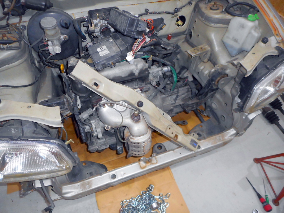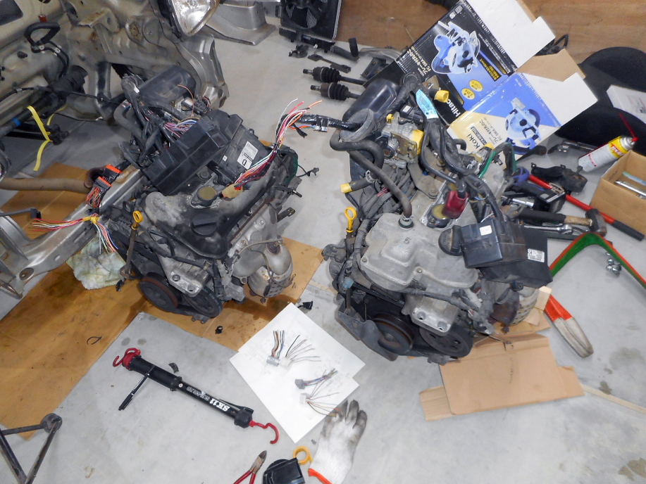 | 少々オイル漏れしていたVVTのソレノイドバルブ取り付け部を修理し、ミッションを取り付け、エンジンを搭載。 ついでに劣化していたドライブシャフトブーツも新品に取り換えておきます。 |