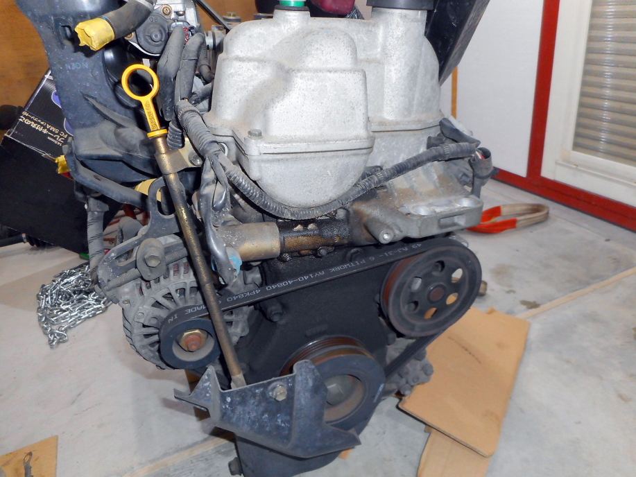 | ミッションのギア比もアルトとワゴンRでは微妙に違うようで、貨物用のアルトのギア比よりワゴンRの方が具合が良さそうなのでミッションもワゴンR用を使います。 さて、一服したらワゴンRのエンジンとミッションを合体させて車体に積み込もうかと何となく降ろしたエンジンを眺めていると・・・。 ・・・あれ? なんか変だぞ? {目をこすって再度よく見る} |