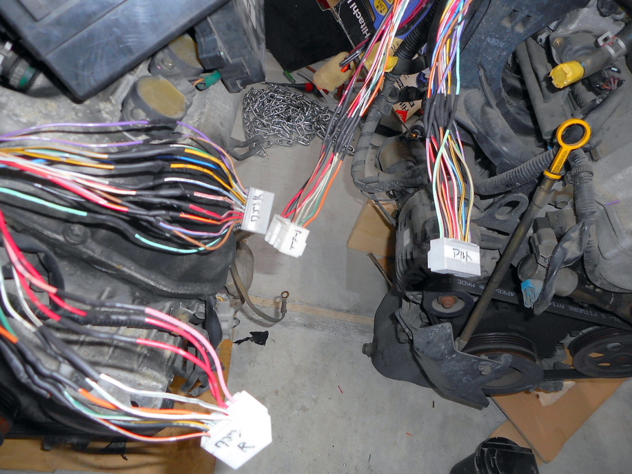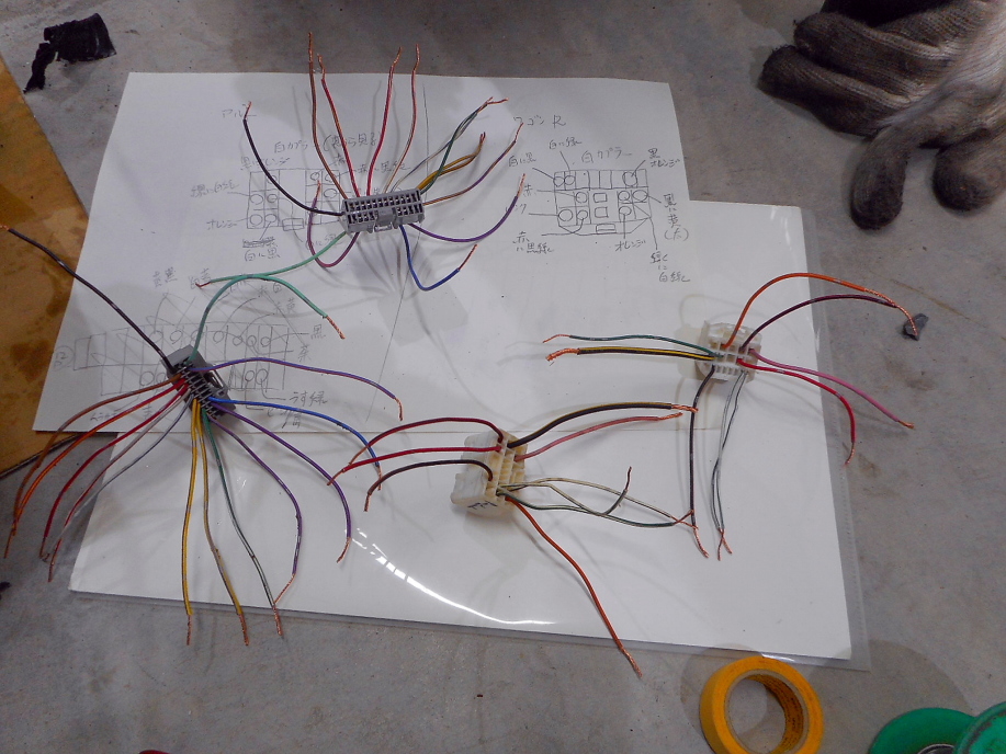 | エンジンハーネスはCPU、ヒューズボックスと共にそのエンジンの物をそのまま付けるので問題ないのですが、エンジンルームから室内に入り、ダッシュボード裏で接続するカプラーの形状が違っています。 そのままではどうしようもないので、とりあえず切断して配線の数を調べてみます。 |