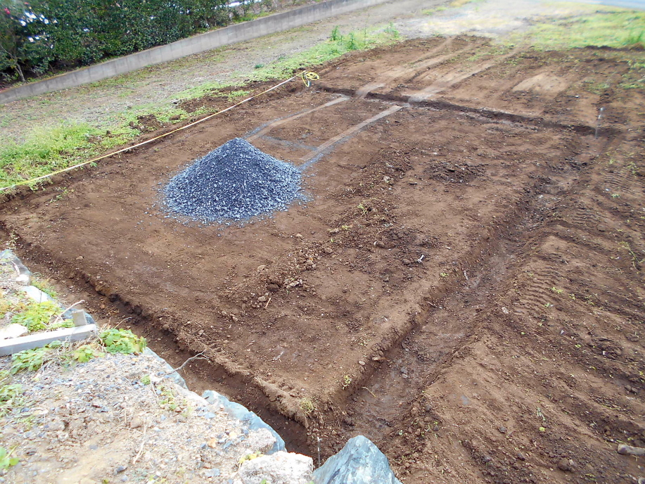 | 建設場所をやや広めに10cm程度掘り下げ、基礎用の溝をざっくり掘ります。 溝の仕上げは手作業で行うのでまだちょっと浅めにしてあります。 ガレージの大きさは7mx6mの予定で、溝もメジャーで大まかに計測してそれに合わせてあります。 |