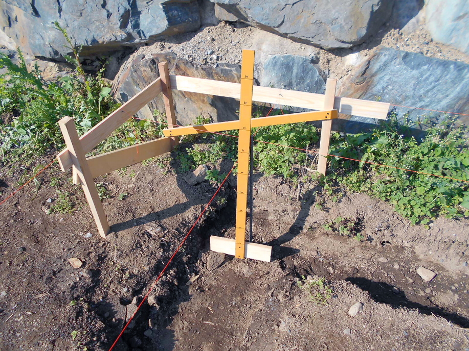 | ガレージ寸法にキッチリ合わせ、直角も出した位置に鉄筋棒を立て、少し離れた位置に水平計測用の「遣り方」を設置します。 遣り方は作業の邪魔にならないようにコーナーのみに設置しました。 「水盛り管」で水平を出し、水糸を張って溝の深さを調整します。 |