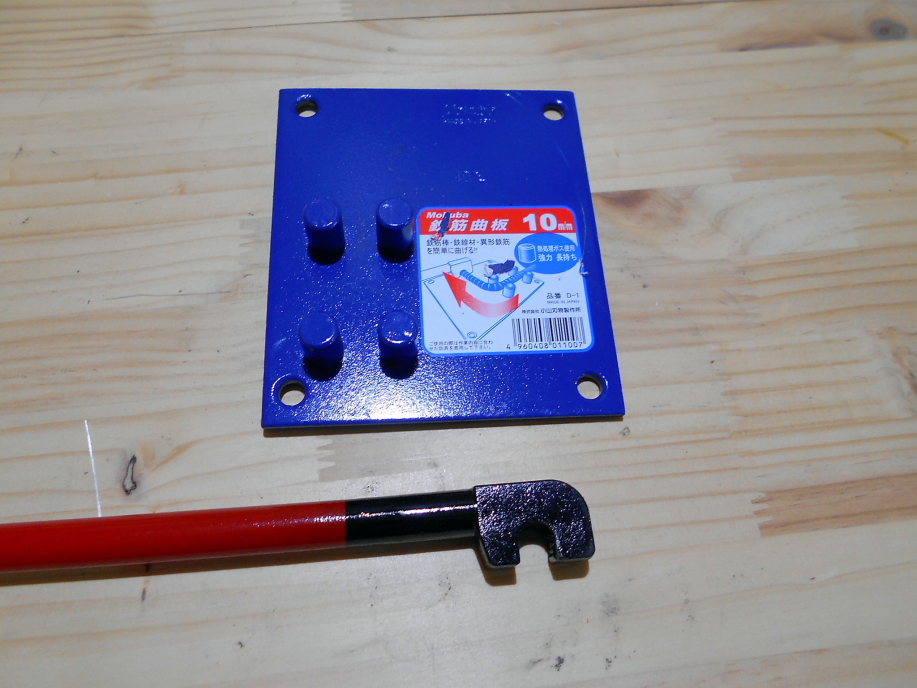 | しかし本数も本数だし、寸法も揃えないといけないのでソレ用の道具を購入しました。 上:鉄筋曲げ板 約1000円 下:鉄筋曲げ棒 約1500円 ・・・名前はそのものズバリですが・・・。 |
