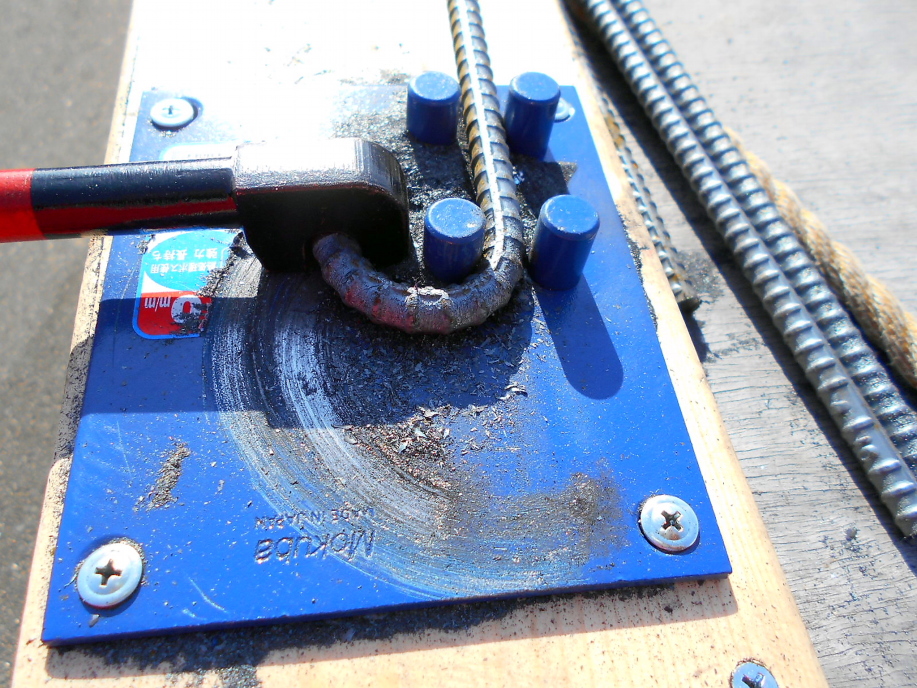 | で、鉄筋を曲げる訳ですが、曲げる前に色々調べてみたところ、この「曲げ具合」にはきちんとルールがあるそうです。 このD10という鉄筋の場合、曲げの内側の直径が「3d以上」 曲げた先のストレート部分が「4d以上」 なんだそうです。「d」は直径の事なので、曲げの内径が30mm以上、ストレート部が40mm以上必要だという事です。 そんなのいちいち計測しながらやるのは大変だなぁと思っていたら、どうやらこの曲げ台で曲げるだけでその寸法になるようになっているみたいです。 (どこにもこの台の使用方法が出ていなかったので推測ですが) 台に立ち上がっている4つのピンがなんか不自然な位置にズレて付いているので、鉄筋をこの位置に置き、試しに台の端に鉄筋の先端を合わせてみました。 |