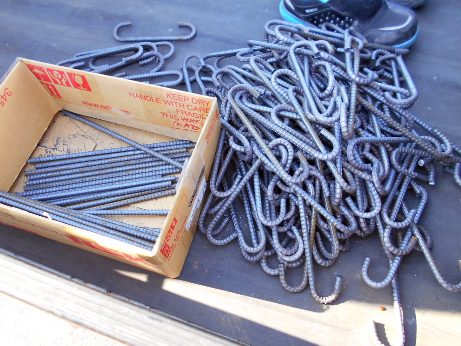 | ほぼ曲げ直径は3dになりました。 ストレート部は5mm位短いかな?3.5d位? まぁ問題ないでしょ((笑) で、サクサク約200本を曲げ加工します。 さすがに専用工具だけあって使い易くてラクです。 1時間位で全部曲げ終わりました。 この短い鉄筋は外側寸法で200mmになるよう、曲げ加工してあります。 |
