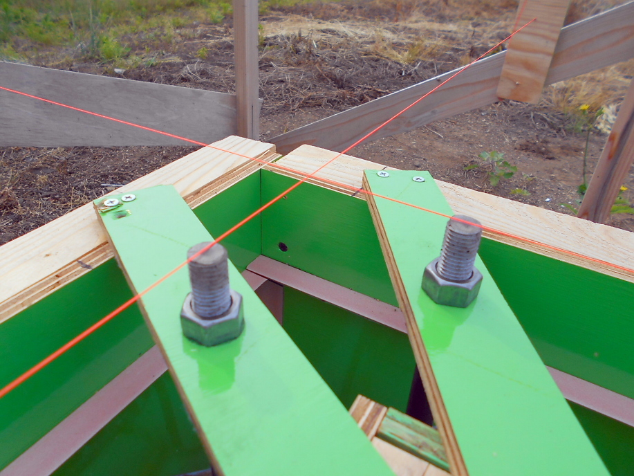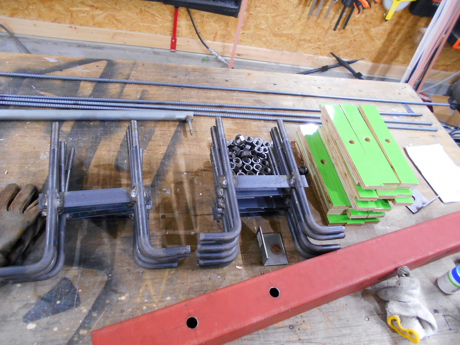 | 土台を固定する為のアンカーボルトを基礎に埋め込みますが、この先の作業をする上で、このアンカーボルトはかなり正確に設置しなくてはいけません。 アンカーボルトは2本1組で埋め込むので、予めアンカーボルト2本をフラットバーで繋ぎ、正確な寸法を出しつつ作業中に動いてしまわないようにしておきます。 廃材の木材で治具を作って溶接します。 |