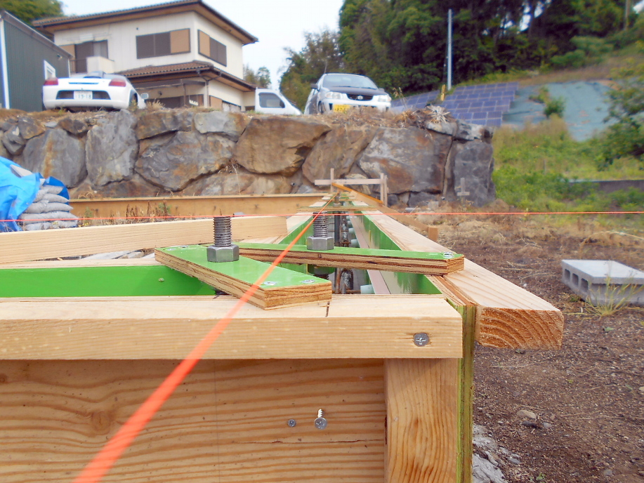 | 型枠にアンカーボルトを設置。 水平の水糸に合わせて慎重に固定します。 生コンの流し込み作業で動かないようにしっかりと板を型枠にビスで固定し、アンカーボルトのナットで板を挟み、こちらもしっかりと締め付けておきます。 |