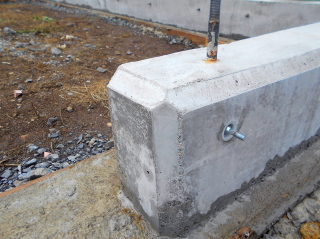 | 仕上がり具合は実際に使う寸法で穴を空けた角パイプに差し込んで確認します。 アンカーボルトを型枠に固定する板も型枠の余りの材料で作ってあります。 |