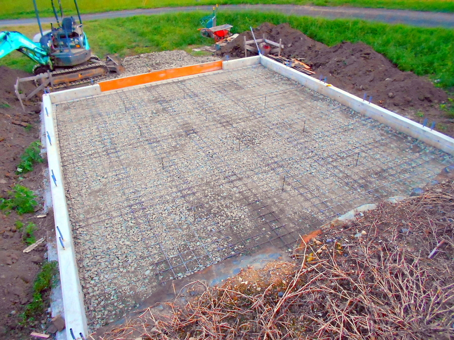 | さすがにこの面積を自分で生コンを練って流し込み、平らに均すのはかなり大変になりそうなので、今回の土間コンクリートは本職の友人に依頼しました。 当初は地面の掘削、砕石入れ、ワイヤーメッシュまでは自分で行う予定でしたが、友人の仕事の日程の関係もあり、全てお願いする事にしました。 ←初日の夕方。 ワイヤーメッシュまで入り、生コンを流せる状態になっています。 さすが本職、早いですね。 |