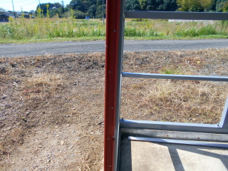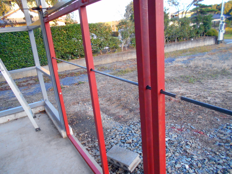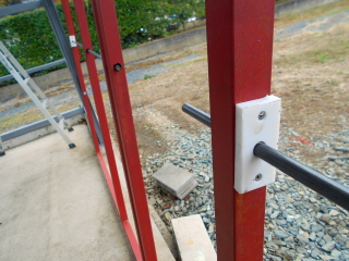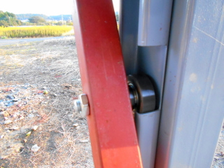 上記状態で下側ドアの側面パイプと柱に固定したレールの交点にローラーを固定すればバッチリの筈です。