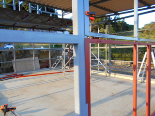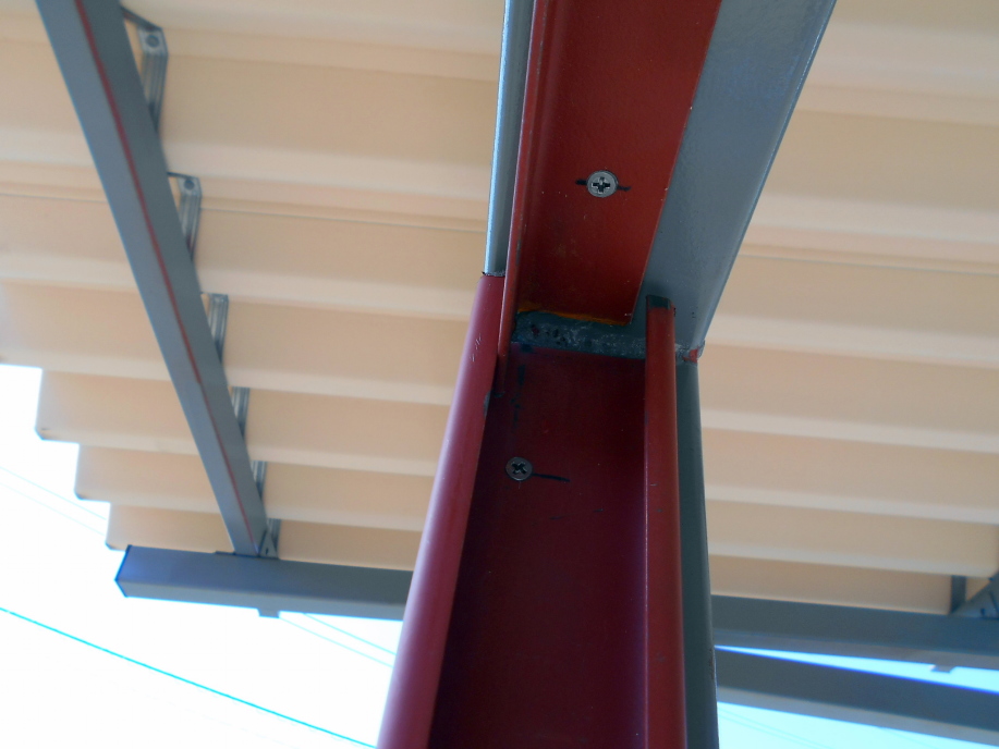 レールに使ったC型チャンネル材の一部を切り取ったものにL字アングルを溶接し、それを柱にドリルビスで固定。