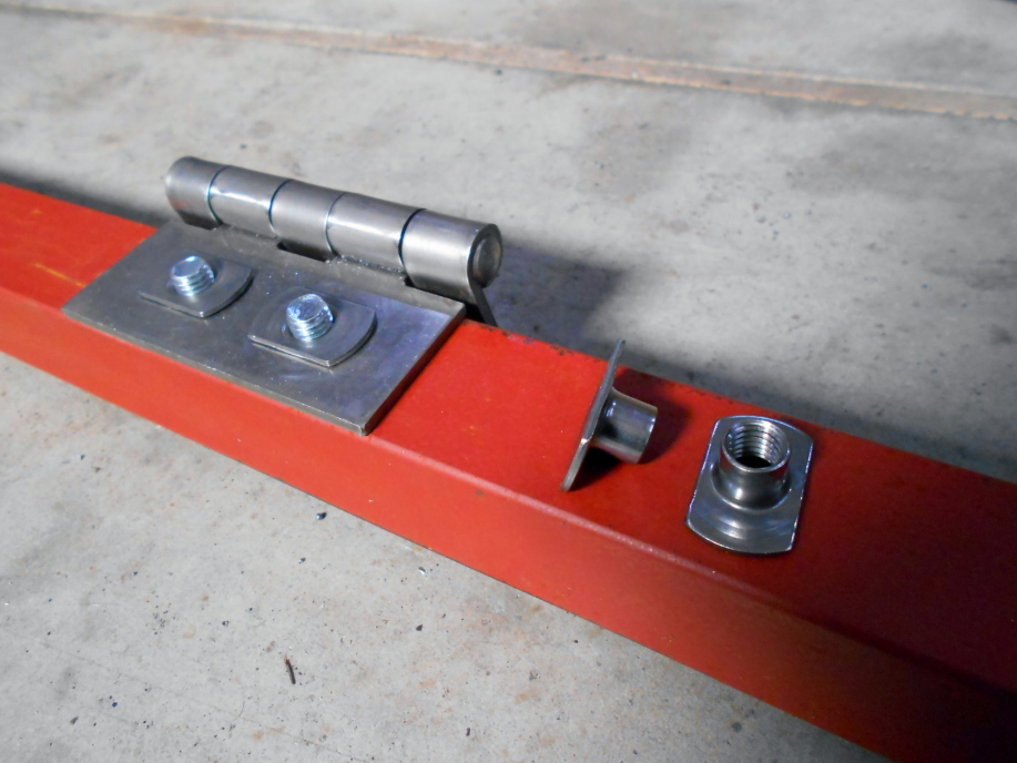ここは普通にボルトとナットで固定した場合、扉の「外装」を取り付けてしまうと、後からボルトを緩めて丁番を取り換える事が難しくなるのでちょっと変ったナットを使用します。