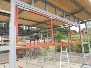 丁番を取り付けたパイプを吊り下げ、ドア用に切り出したパイプをガレージ間口に合わせながら溶接していきます。