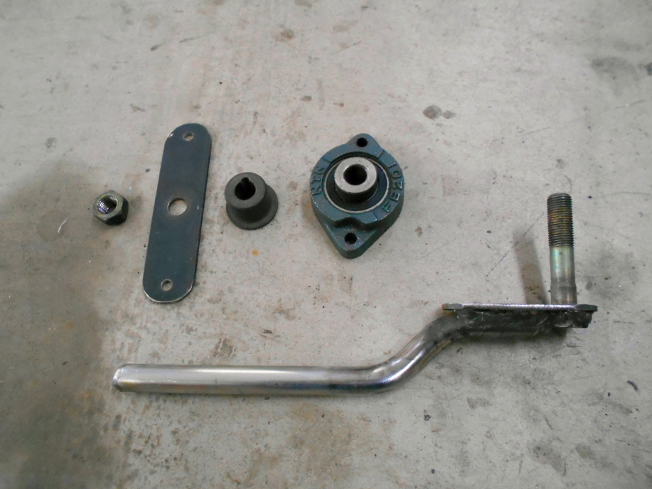 右からM12のボルトに鉄の丸棒を曲げた物を溶接した物、軸径12mmのベアリングユニット、軸径12mmの金属カラー、3mm厚フラットバーに穴をあけた物、M12ナット。 |