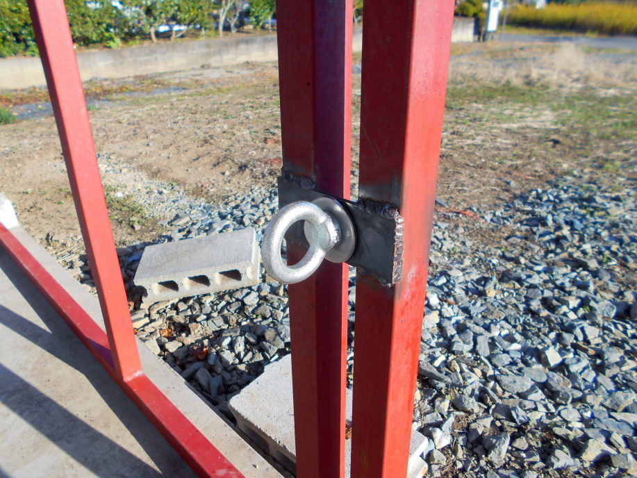 何度か扉を開閉し、丁度良さそうな位置に4.5mm厚のフラットバーを溶接し、吊り上げ用のフックを掛ける金具を取り付けます。
