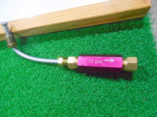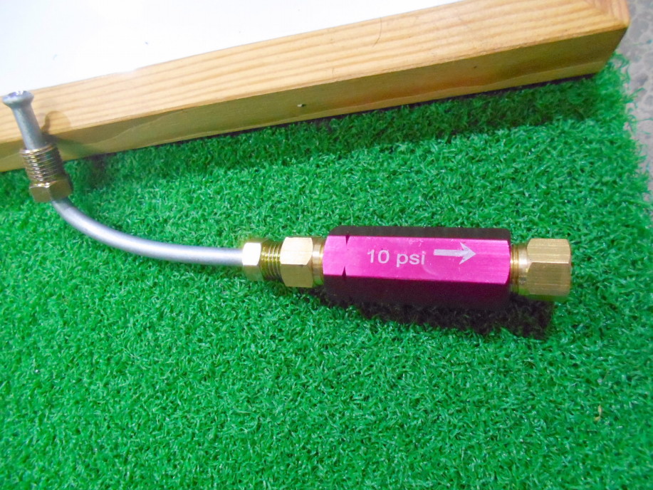 | 残圧がゼロで良いディスクブレーキの時は必要ありませんが、ドラムブレーキの場合はドラムブレーキのホイールシリンダーに「残圧」がかかっていないとブレーキオイルが漏れてしまうので、 配管の途中に「残圧バルブ」を取り付けます。 このバルブは一度ブレーキを踏んで圧力をかけると、このバルブ以降の配管に本体に表示してある10psiの圧力を保持し続けます。 方向性があるので本体に記してある矢印の向きを圧力のかかる方向合わせてに取り付けます。 ところでこの残圧バルブのINとOUT、Pバルブ本体のINとOUTのねじ山は国産のフレアナットとピッチが違うので注意が必要です。 両バルブに接続できるピッチは3/8-24なのでこのサイズのフレアナットが計4個必要です。 このフレアナットはキノクニさんの品番でFN0004。 車体側のフレアナットはFN0001。 |