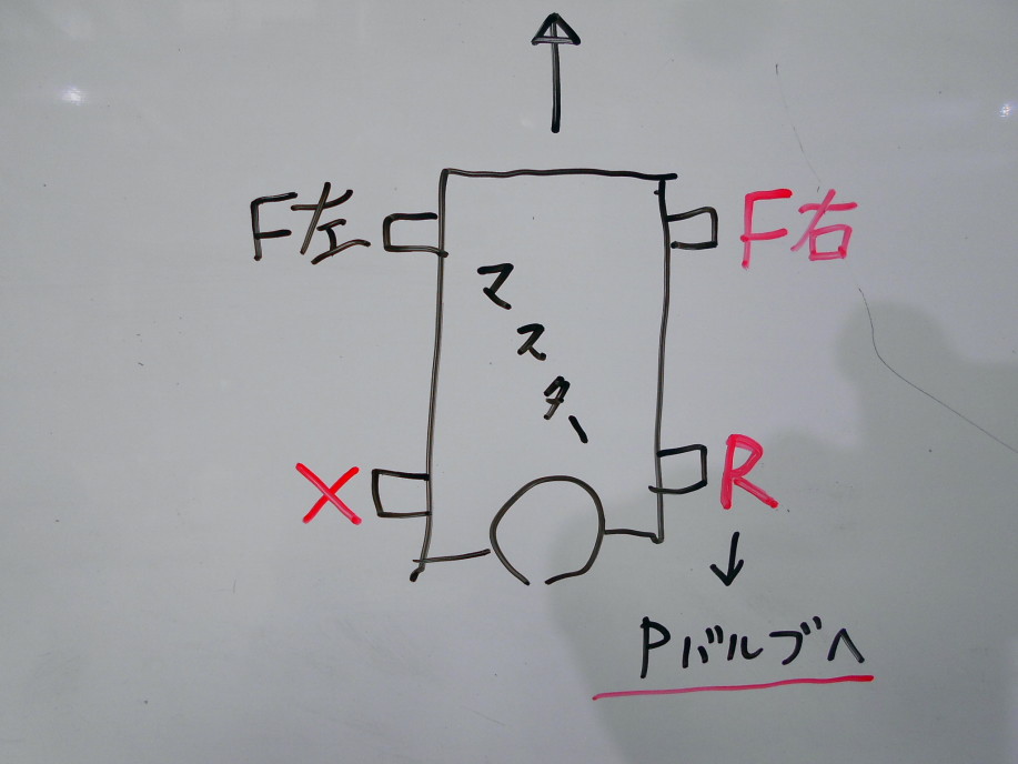 | 加工後はこのような配管になります。 マスターシリンダーからリアブレーキに向かう配管は2本から1本になるのでちょこっと軽量化になるかな?(笑) ×印のところはメクラねじで塞ぎ、リアに向かう配管は1本にします。 |