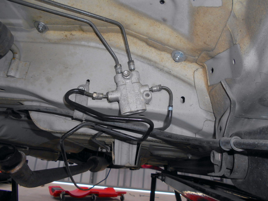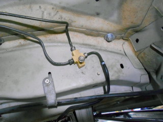 | 元々の配管はマスターシリンダーから2本伸び、右リアのボディに取り付けられている純正のプロポーショニングバルブに入り、そのまま左右に分かれて取り付けられています。 |