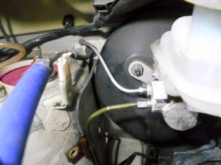 | フロント左用の配管は少し長めだったのでほど良く曲げてマスターシリンダーの反対側に接続。 リア配管の片側は既にメクラねじで塞いであります。 |