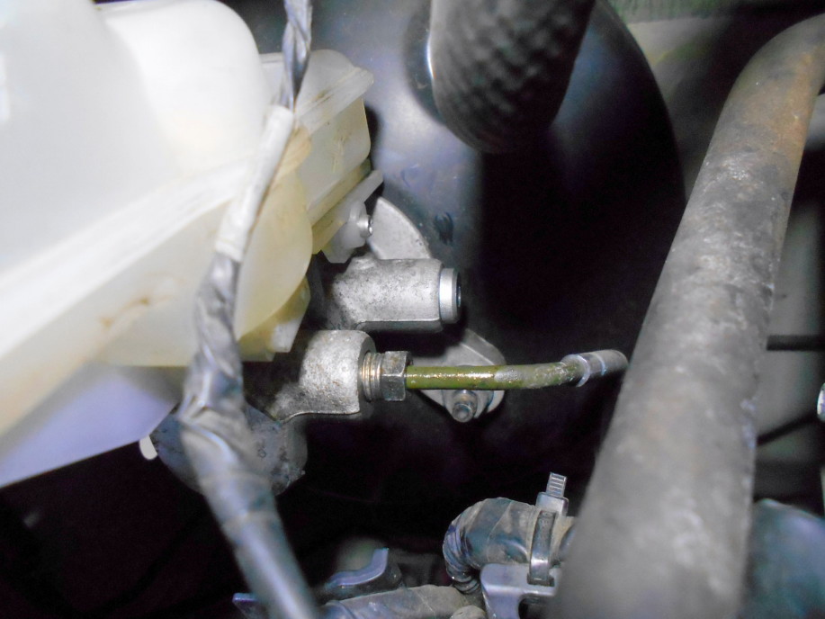 | Pバルブは室内に取り付けるので、配管を室内に向かって伸ばします。 最短で配管したかったのでマスターバックの横のボディに穴をあけてブレーキパイプを通しました。 |