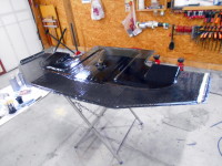 | 2025/9/15(日) カーボンリアフェンダーの積層が終わって樹脂塗り+研ぎを繰り返してやっと平滑な面に仕上がってきました。 この段階でやっとボディから剥がして周囲を切り揃えて再度ボディに仮付けしたところ。 当たり前ですがピッタリフィット。あとは表面にクリヤー塗装すれば完成です。 まだ重さは測ってないけど、持ってみた感じだと7〜800gといったところかな? |