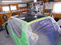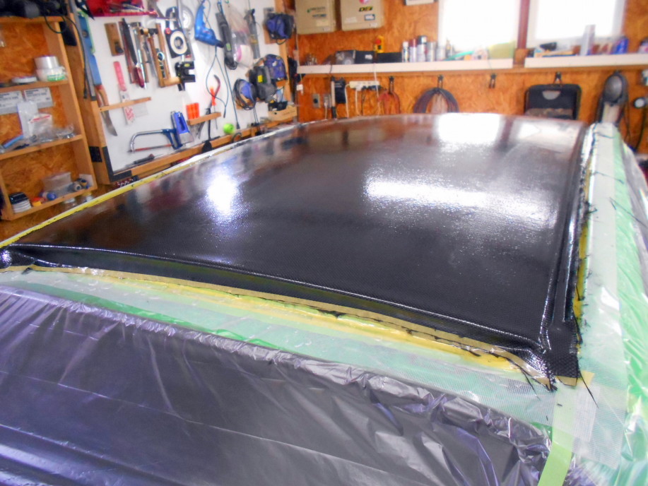 | 2025/6/15(日) カーボンルーフの積層が完了。 以前作ったFRPルーフがあまり軽くならなかったので 今回はとにかく軽く作るため、カーボンクロス2プライのみ。 使用したカーボンクロスとエポキシ樹脂の重量だけだと1.5kg程度。 表面を仕上げるために追加で樹脂を塗りますが、それでも2kg以下は確実ですね♪ はがしてみないと分からないけど恐らくペラペラでしょうね(笑) |