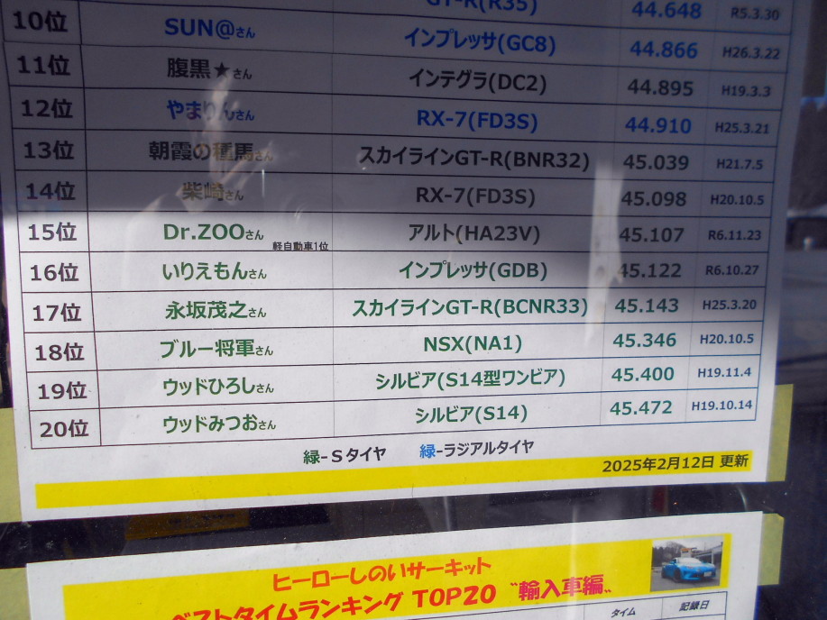 | 2025/2/24(月祝) 連休なので今日は来月一杯で閉場する事が決定したヒーローしのいへ。 寒波が続くこの冬、奥に見える那須連山も白く雪をかぶっています。 ユーズドと新品のGSを持ち込み、最後に44秒台に入れて記念にしようと思っていましたが、終始タイヤが全く発熱せず、エア圧を色々イジるも全然いつものグリップが出てきません。 走行後のタイヤを見てもまるで雨の日に走ったタイヤみたいに全然溶けておらず、良く言えばただきれいに摩耗しているような状態。 そういえばしのいを走るのは毎年3月以降で、ベストが出るのも毎年4月か5月の気温が少し高くなり、Mコンを使う頃だったのを思い出しました。 寒いので馬力は出ていると思うのですがそれを路面に伝える術がなく撃沈・・・。 3月の週末は全て貸切で埋まっているとの事なのでしのいを走るのは今日が最後ということになりそうです。 なのでヒーロしのいでのベストタイムは昨年11月に記録した45秒1で幕となります。(閉場までこのままのランキングで終了すると一応、軽自動車最速です) |