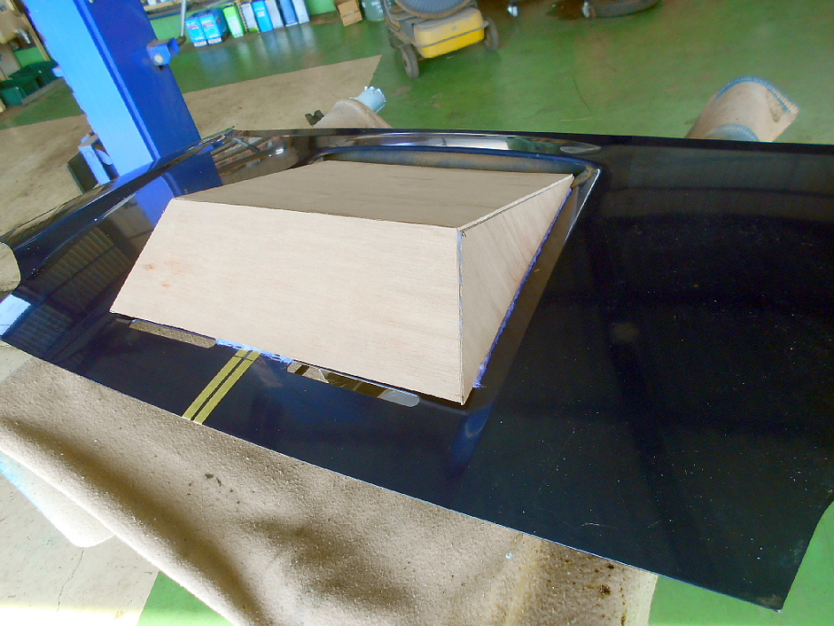 | MR-Sのエンジンフードエアアウトレットを製作します。 あとでエンジンフード本体もFRPで製作しますが、フード本体はちょっと変わった方法で製作する予定なので、その際に一体化していると都合が悪いの為、アウトレットは単独で製作します。 アウトレットは通常の方法で作るので特に目新しい事は無いです。 まずマスター型を作りますが、マスター型の材質は最終的にメス型を積層する際に樹脂で溶けなくて造型し易ければ粘土、石膏、発発泡スチロール、木材でも鉄でも段ボールでもなんでも構わないので自由にやりましょう。 その中で自分にとって使い易い材料や方法が見つかるので何でも試してみましょう。 さて、今回は4mm厚のベニヤ板でマスター型のベースを作ってみました。 完成予定の大きさより小さ目に作っています。 組立てはホットボンドで付けただけ。 |