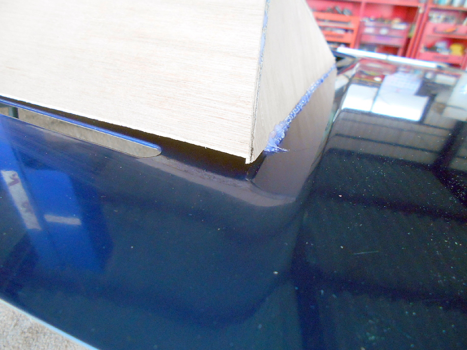 | エンジンフードにもホットボンドで付けただけです。 板は切り出しただけで特にフードに合わせて削っていないので隙間だらけですがこの段階では「全く」気にしていません。 |