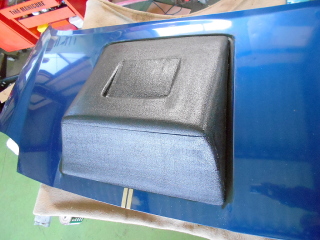 | 接着剤が乾いたら最初はサフォーマー、次に荒目のペーパー(#60とか)、最後は中目(#240とか)で面を仕上げていきます。 ダクト上に窪みを掘っていますが、これはこの面がベタっとした平面になる為、完成品に剛性が無くフニャフニャになるのを防ぐ為に設けてあります。 形状そのものに特に空力的な意味はありません(笑) |