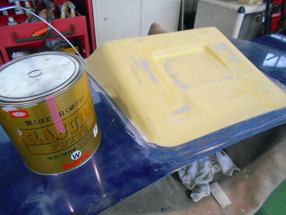 | ペンキの表面にペーパーでさらっと足付したらパテを塗ります。 パテと言っても一般に鈑金とかに使うポリパテではなく、建築で壁とかに使う「粉パテ」です。 基本的に粉状のものが袋入りで販売されていて、水と混ぜて使います。 「石膏」と同じような物ですが、石膏は水と混ぜる際にちょっとコツが必要だったりするのですが、コレはただ水と混ぜてかき混ぜるだけで普通にパテとして使えます。 どこのホームセンターにも置いてあるし価格もかなり安く、この位の袋で1000円前後、セメント袋位の大きさでも2000円前後で購入できます。 種類も細目から中目、厚塗り向いた荒目の物もあります。 混ぜる水の分量は必要な粘度になるように自由に調整して問題ありません。 ポリパテに比べてちょっと「コシ」が無いのでヘラできれいに塗るのは難しいかな? 半面、削る分には簡単に削れるので適当に多めに盛って削る気持ちで塗った方が良いかもしれません。 |