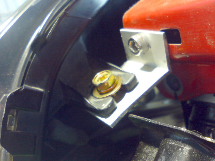 とりあえず両面テープでライトにアングル材を固定、ボディ側の純正ライト固定用のブラケットからステーを伸ばして仮固定。