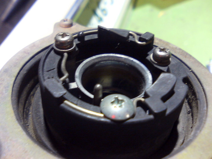 更にバルブ固定用の針金を押さえているビスの頭が引っかかってしまうので、引っかかるビスを頭の薄いビスに交換しました。 |