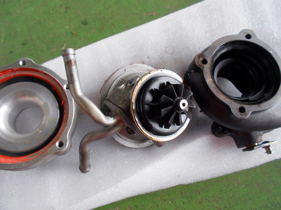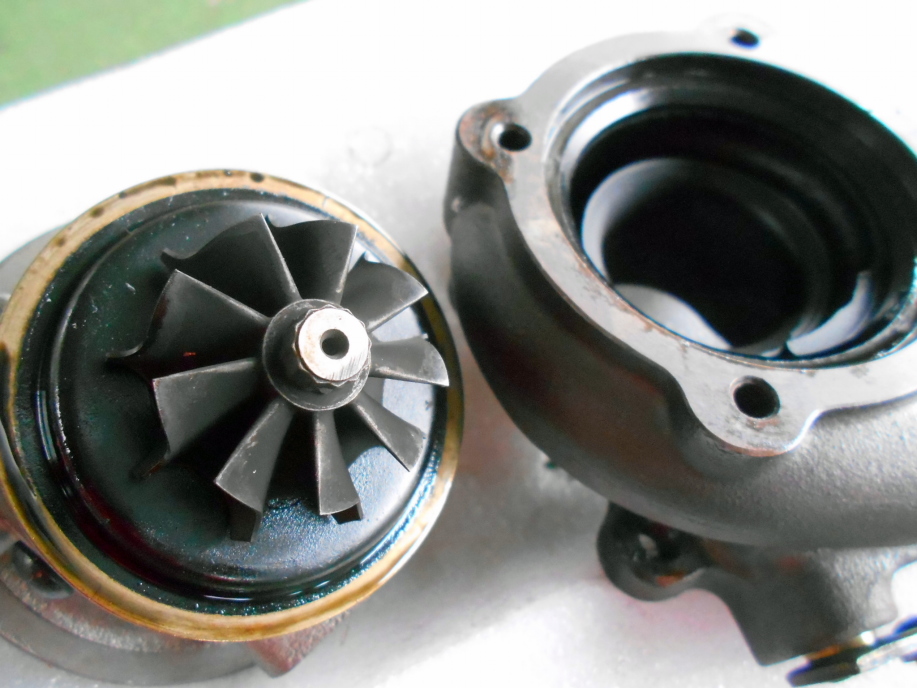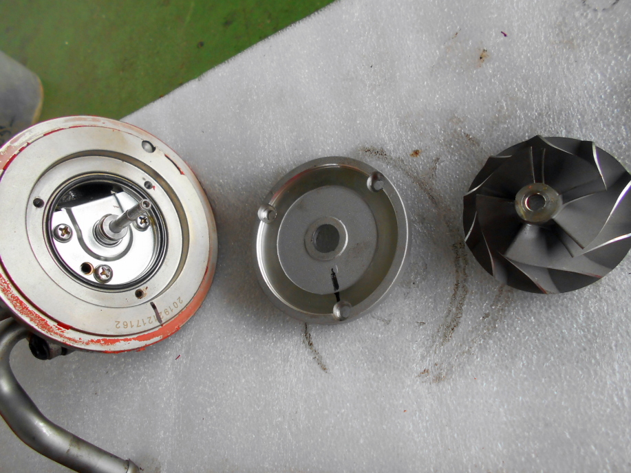 | リビルトで購入し、アルトに取り付けて僅か1回のサーキット走行で煙が出てしまったHT07タービン。 このタービンの上でのパワー感はやはり捨てがたいし、そもそも勿体ないので修理を試みてみます。 取り外し前の点検ではインテークパイプやインタークーラー内にオイルがまわった形跡が一切無かったので、タービンのエキゾースト側からのオイル流出だと考えられます。 シャフトのガタもチェックしましたが、ボールベアリングではないので少しだけ遊びがある程度で、特に問題なさそうです。 |