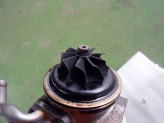 | 外したタービンホイールはその裏のカバーと共にオイルが焼けてこびりついています。 | |