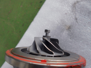 | センターカートリッジにタービンシャフトを差し、コンプレッサーホイールを差し込んでナットを締めて固定します。 ネジ部にはネジロックを少量塗布しておきました。 |