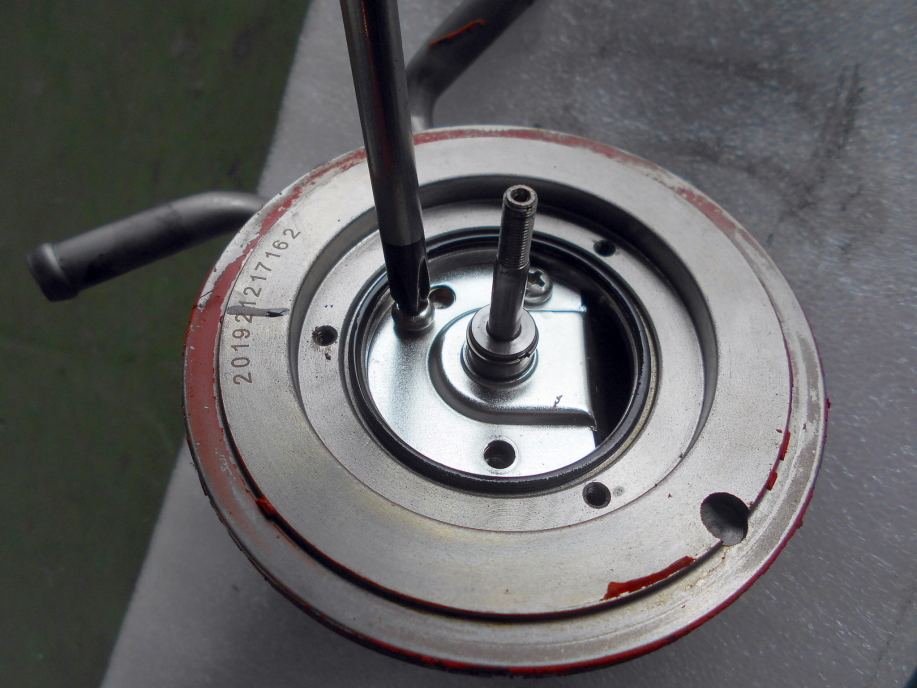 | コンプレッサーホイール側に7mmのナットが付いているのでこれを緩めます。 逆ネジになっているので注意。 ネジロック剤も塗布されているようで、少し硬いので慎重に。 ナットが外れたらコンプレッサーホイールは差し込んであるだけなのでマイナスドライバーを2本使い、軽くコジって取り外します。 |