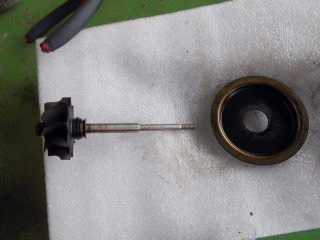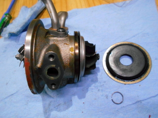 | プレートを外すと軸受のブッシュとオリフィスが現われます。 ブッシュもオリフィスもただ嵌っているだけなのでタービンをひっくり返すとポロっと落ちてくるので無くさないように注意。 Oリングも外しておきます。 |