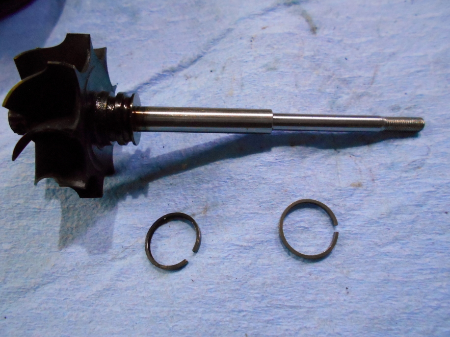 | 今回のタービンO/Hで肝心な部品、タービンシャフトの首元に付いているリング(シール?)だけが寸法が全く同じなので使えそうです。 左が外した方、右がキットに入っていた物。 リングの合わせ目の隙間が違いますが、これは取り外す際に広がってしまった為です。 |