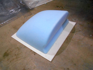 | アルトバンターボのインタークーラー用インレットダクトを作ります。 100mm厚のスタイロフォームを切り出し、適当に削って仕上げます。 底部にはフランジ用にベニヤ板を接着しておきます。 |