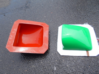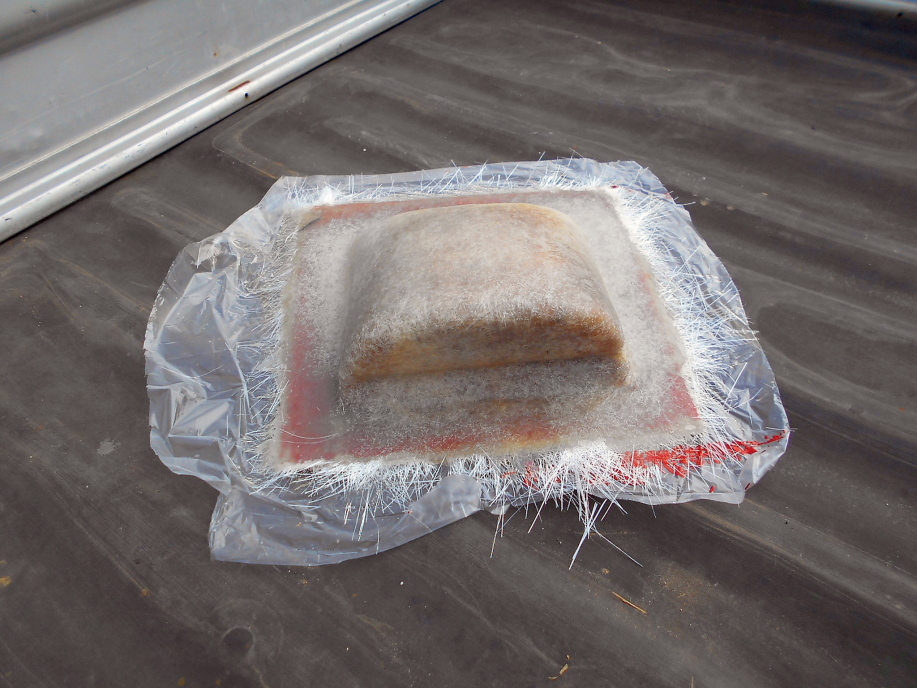 | いつものようにゲルコートもどきを塗布し、ガラスマットを3プライ積層。 (今回は一個だけ成型品を抜ければいいので、肉厚はやや薄め) |